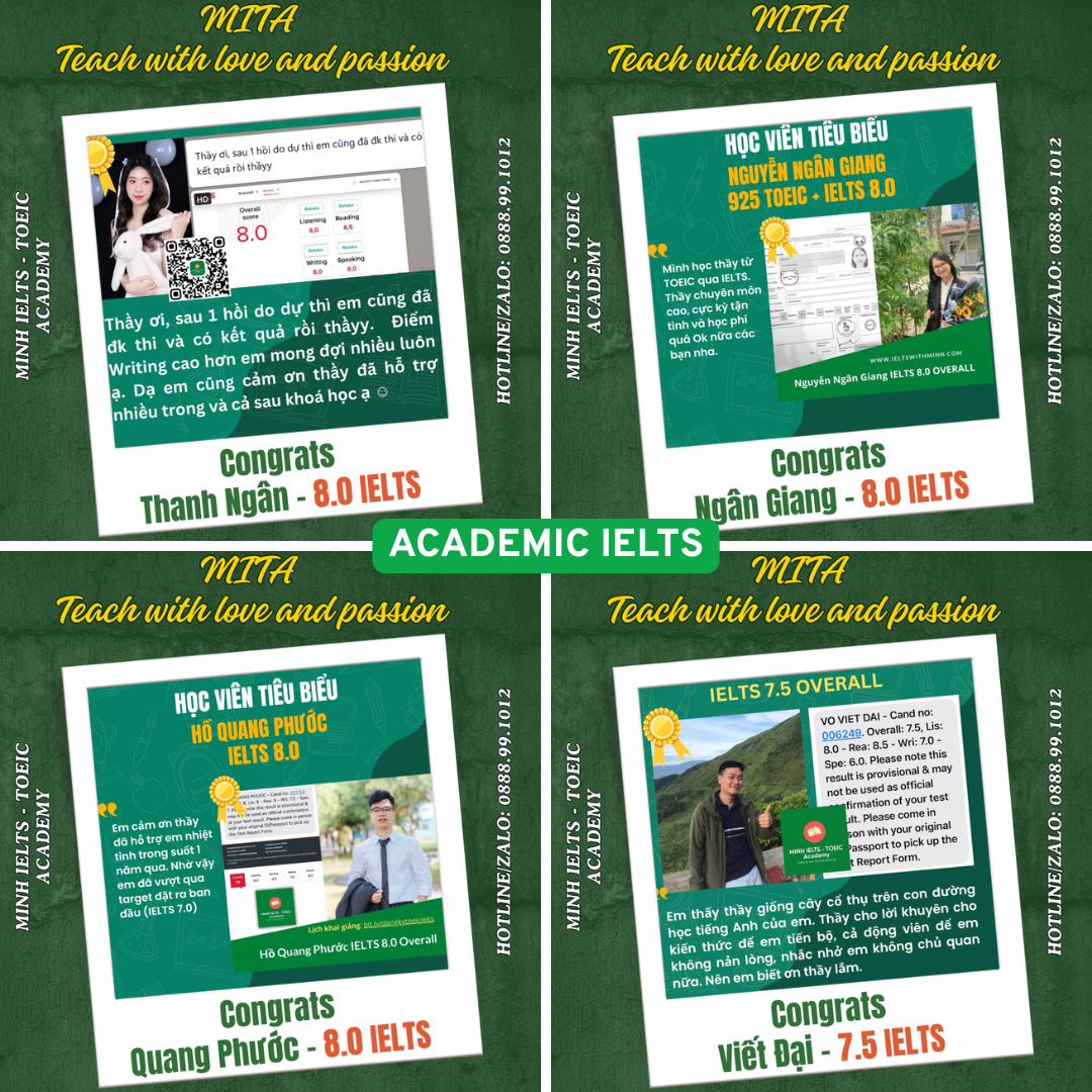 Mình là người dạy. Mình đã đạt IELTS 8.0 Overall, trong đó không có kỹ năng nào dưới 7.5 (các kỹ năng đều từ 7.5 đến 8.5).