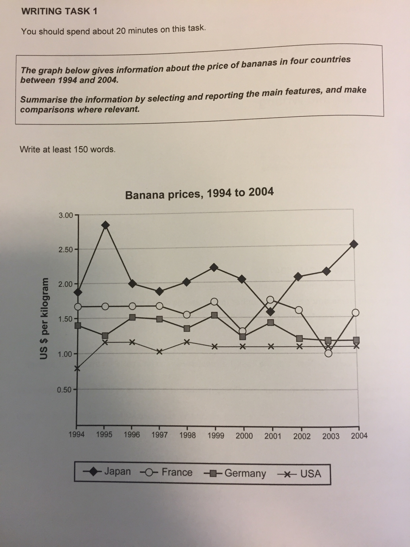 The line chart compares the cost of bananas in Japan, France, Germany and the USA from 1994 to 2004.