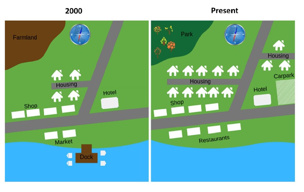 The two maps below show a small village in the west of Ireland in the year 2000 and at the present time. Summarise the information by selecting and reporting the main features, and make comparisons where relevant.